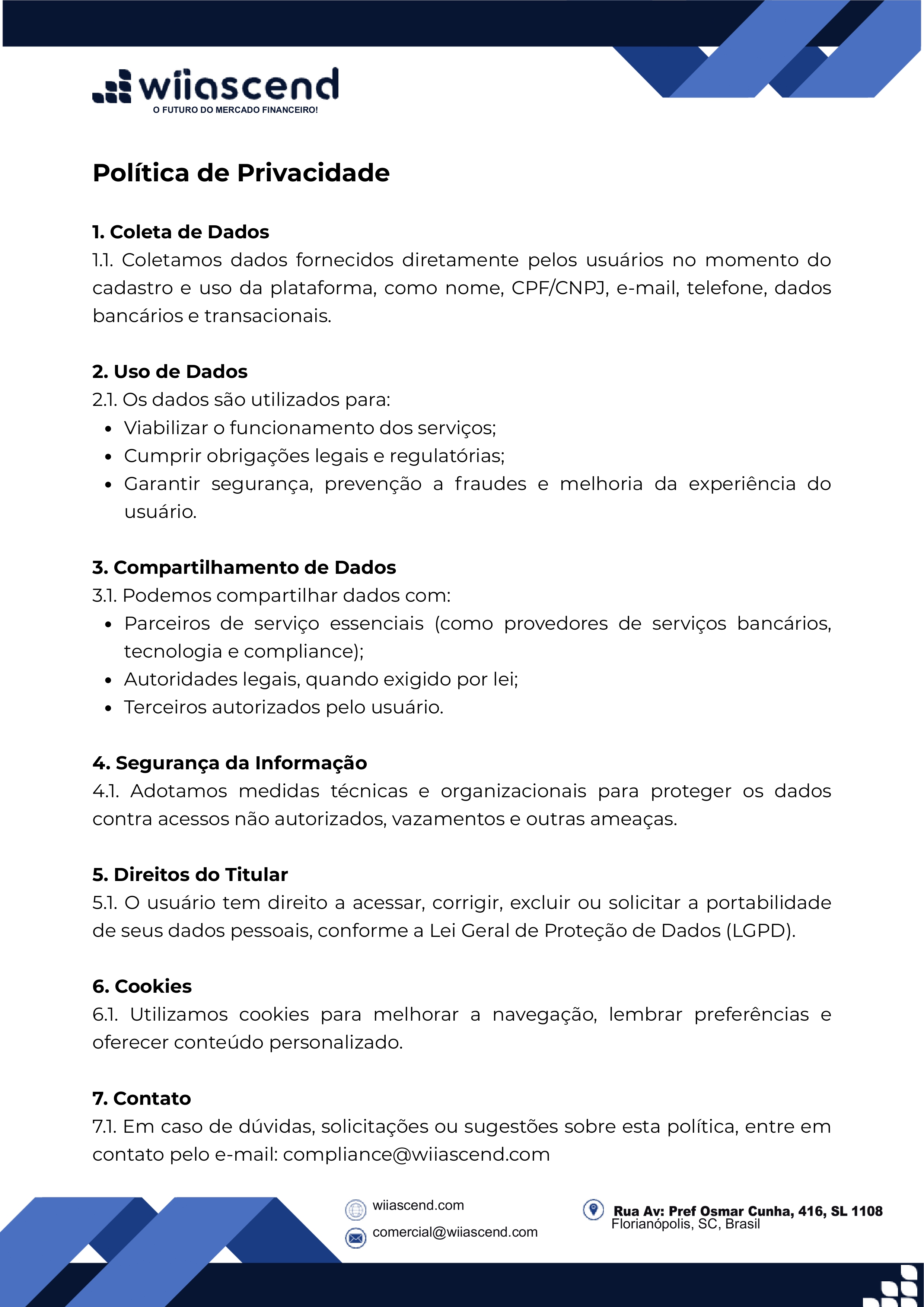 Toda comunicação através da rede mundial de computadores está sujeita a interrupções ou atrasos, podendo prejudicar ordens, negociações ou a recepção de informações atualizadas. A Wii Ascend, exime-se de responsabilidade por danos sofridos por seus clientes, por força de falha de serviços disponibilizados por terceiros, incluindo, sem limitação aqueles conexos à rede mundial de computadores. Todos os elementos que compõem este site, incluindo, mas não se limitando, as suas marcas, sinais de propaganda, textos, fotos e outras imagens, são propriedade e objeto de direitos exclusivos de seus respectivos titulares e/ou licenciados. A reprodução destes elementos sem prévia autorização dos respectivos proprietários e/ou licenciados constitui ou pode vir a constituir violação de propriedade intelectual, sujeitando os infratores às penalidades cabíveis na legislação civil e penal. Caso tenha interesse em utilizar algum dos elementos contidos neste site, entre em contato com a Wii Ascend - CNPJ: 59.554.586/0001-89.